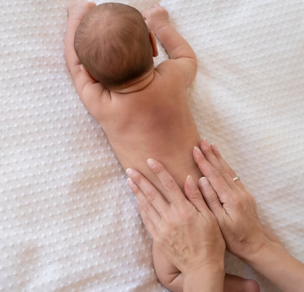 베이비오일을 엄마 손에 덜어 아기의 몸